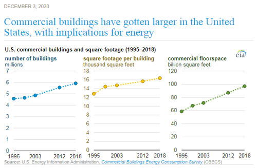 Commercial buildings have gotten larger in the United States as their floor space continues to grow faster than the number of commercial buildings, according to preliminary results from the U.S. Energy Information Administration’s (EIA) 2018 Commercial Buildings Energy Consumption Survey (CBECS).