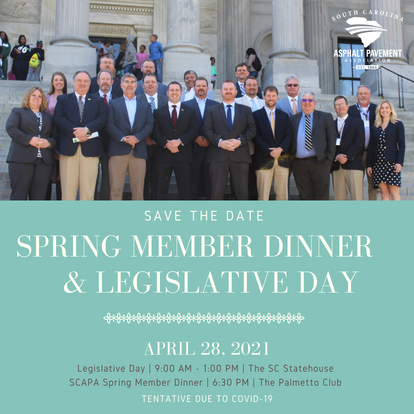 SCAPA Members please save the date (tentatively) for the SCAPA Spring Member Dinner and Legislative Day. Both SCAPA Member Activities will be held on Wednesday, April 28, 2021.The event is tentative due to COVID-19. Watch for more information in the next issue of the Paving the Way newsletter.