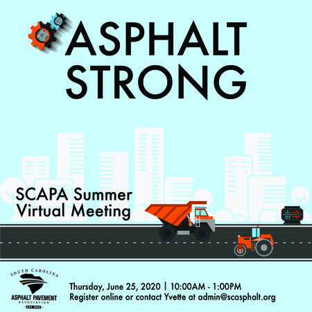 SCAPA Members, please join your asphalt pavement industry colleagues for our first-ever Virtual Summer Meeting, entitled ASPHALT STRONG. Due to the decision to cancel our SCAPA Summer Conference in light of COVID-19, we felt it imperative to move forward with a virtual meeting for our SCAPA Members. The SCAPA Board of Directors and staff are looking forward to this unique online venue to be "together" and share updates on the strength our industry is showing in these unprecedented times. During this virtual meeting we will provide valuable information and updates from our industry and legislative partners, and we plan to include some information on changes to industry practices brought on by COVID-19. Please register for this FREE event as soon as possible, so we can plan accordingly.