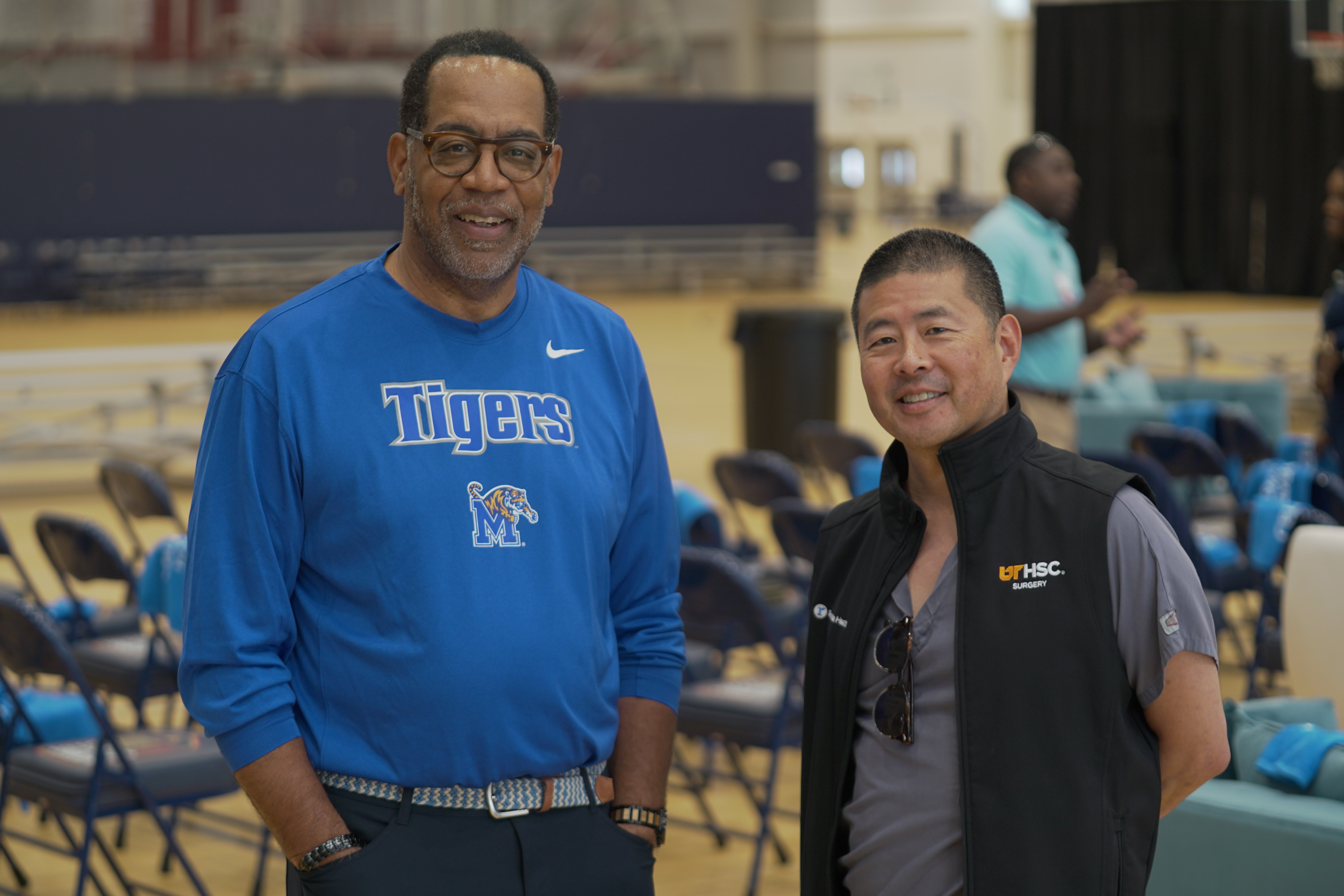 Regional One Health physician-CEO Dr. Reginald Coopwood with “physician champion” Dr. David Shibata from Surgical Oncology during one of the health system’s basketball-themed events designed to boost physician engagement.