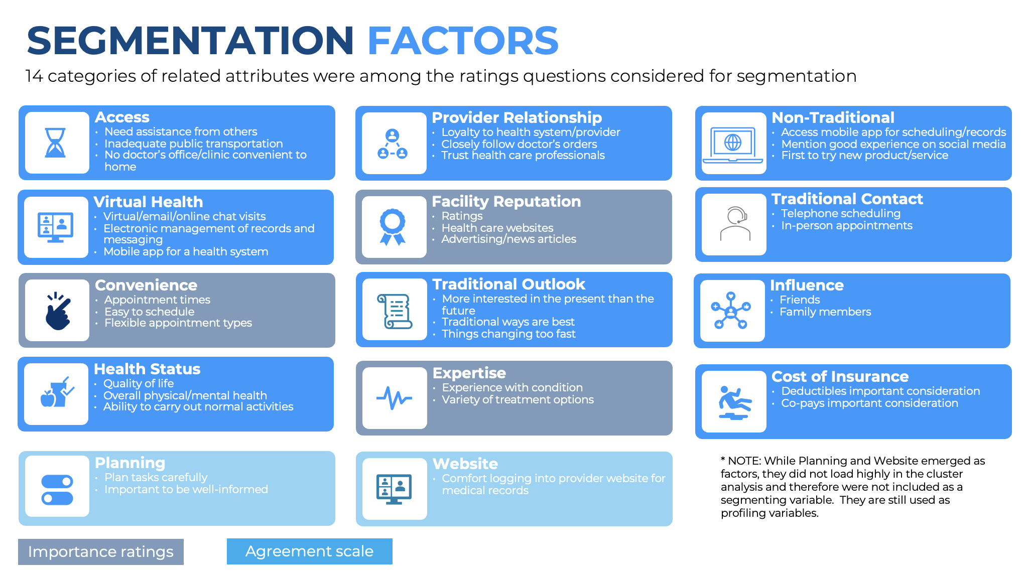 Segmentation factors such as convenience and reputation were assessed based on “importance ratings” (i.e., how much value respondents gave them), while others such as provider relationship and the availability of virtual health services were evaluated using an agreement scale, according to McKeever (Figure).