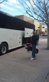 Golfers headed to the award-winning Twin Warriors Golf Course at the Hyatt Regency Tamaya Resort and Spa for 18 holes of golf on Tuesday. Bus service was provided to and from the hotel to the course, and boxed lunches were served. Photo: Bob Blomquist from The Insulation Place out of North Dakota gives a thumbs up as he boards the bus heading to the golf course.