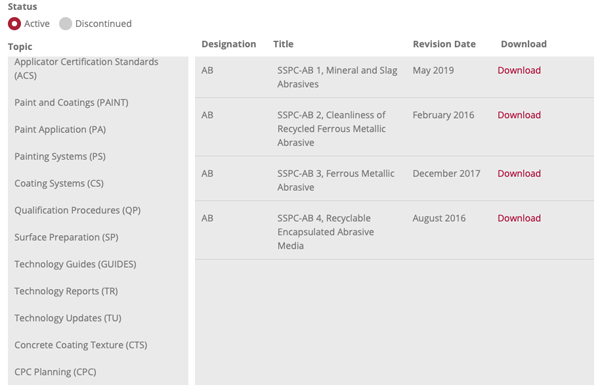 Note that only Active standards can be downloaded. Users who wish to access a copy of a Discontinued standard must submit a request to the Technical Services department at SSPC. Non-members can also use the tool to find standards, however they will see an “Add to Cart” link rather than a “Download” link and will still need to go through the checkout process.