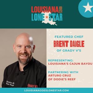 Louisiana’s Cajun Bayou Tourism, the destination marketing organization for Lafourche Parish, announced this week that Chef Brent Daigle of Grady V’s in Thibodaux has been selected to represent Lafourche Parish at the “Louisiana Goes Lone Star” culinary event in Dallas, Texas.