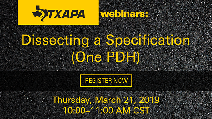 Larry Welch and special guest Robert Lee Robert Lee, Hot Mix Asphalt Performance Manager, Texas Region, CRH Americas Materials, Inc.will take a detailed look at the six parts of a specification using the Dense Graded Specification for Local Governments as an example. You can find our example specification in Appendix A of the Texas Asphalt Pavement User Guide. One PDH Date: Thursday, March 21, 2019 Time: 10:00 AM CST Start Date: 3/22/2019 10:30 AM CDT
