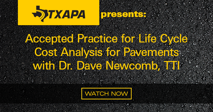 According to the Transportation Equity Act for the 21st Century (TEA-21) Life Cycle Cost Analysis, or LCCA, is a process for evaluating the total economic worth of a useable project segment by analyzing initial costs and discounted future costs, such as maintenance, reconstruction, rehabilitation, restoring, and resurfacing costs, over the life of the project segment. Join TXAPA and Dr. David Newcomb of the Texas A&M Transportation Institute and learn the fundamentals of LCCA.