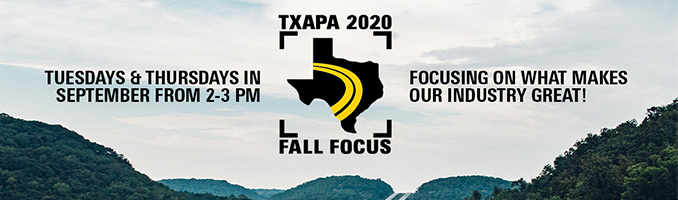 Every September for the past 45 years, TXAPA has held an Annual Meeting merging the best in education, networking, and fun. This year, TXAPA is hosting a series of live broadcasts designed to bring some of what we love best about the Annual Meeting to you! We will be broadcasting live September 8-29, 2020, every Tuesday and Thursday from 2-3 PM. Each installment will have a new focus and include subject matter experts from TxDOT and industry covering topics such as safety, performance, ethics, and more.