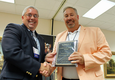 Three TMEPA Member Systems received the Community Service Award. These prestigious awards are given in three groups and based on the number of meters. The criteria used to choose the winners from the nominees includes achievement or sustained performance showing the commitment of the member and its employees to enhancing the quality of life in its community, both as an organization and employee involvement. The system also must show a history of enhancing the prestige of Public Power, involvement with TMEPA and outstanding and consistent customer service, quality of service and system improvement. All municipal electric systems show these traits on a daily basis. All are truly deserving. Kendall Bear, President presented all the awards. The winners of the 2015 Community Service Awards are: