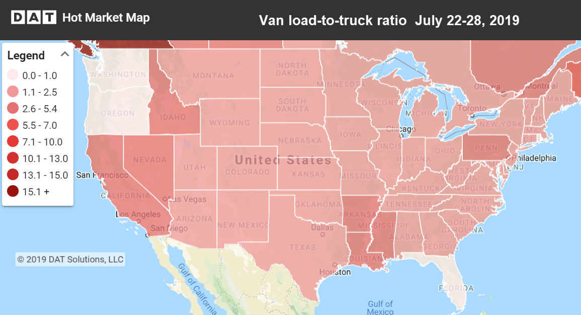 Even as the summer slump continues, July is still on pace to beat May volumes, with a national average van rate that's about 5 cents per mile higher than it was before the June peak.