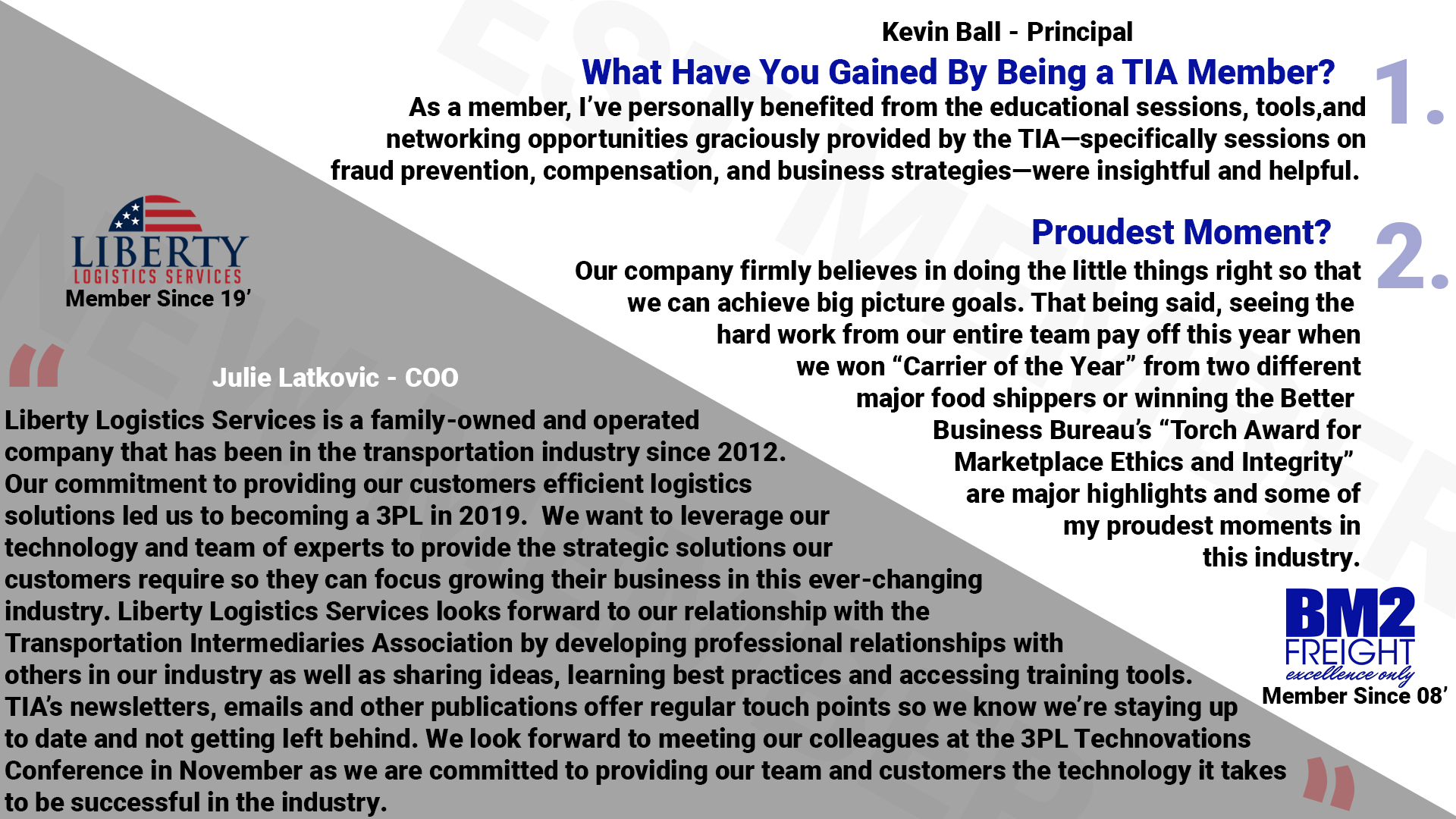 Did You Know? TIA offers Consulting Services. With the everchanging transportation landscape, your business must make thoughtful and strategic decisions to grow, sustain and survive. As the voice of the 3PL industry, TIA is pleased to offer top-tiered coaching, assessments and education for 3PLs to leverage today. To speak to someone about TIA's Consulting Services, or receive recommendations on what available resources can accelerate your company's growth, FILL OUT THIS FORM, and a coach will reach out to you.