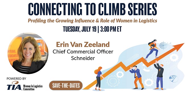 ![]() ![]() ![]() SAVE THE DATE! Join us today at 3pm for our next Connecting to Climb Series from the TIA Women In Logistics Committee. Featuring Erin Van Zeeland, Group SVP/GM of Logistics and Chief Commercial Officer (CCO) at Schneider National, will share insights on her personal journey and secrets to her success, focusing on empowering and growing the influence, role, and impact of women in the logistics industry. Register Now! ![]()