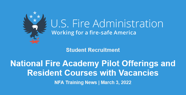 Pilot offerings: P0264 – Plan Review of Fire Alarm System Installations P0780 – Fire Investigation: Forensic Interviewing and Evidence Courses with vacancies: R0147 – EMS Incident Operations R0150 – Management of EMS R0154 – Safety Program Operations R0200 – Leadership Strategies for Community Risk Reduction R0297 – Command and Control Decision Making at Multiple Alarm Incidents R0233 – Chemistry for Emergency Response R0243 – Hazardous Materials Incident Management R0247 – Advanced Life Support Response to Hazardous Materials Incidents R0258 – Management and Safety in Response to Hazardous materials/WMD Incidents R0263 – Commercial Fire Sprinkler Plans Review R0308 – Command and Control of Fire Department Operations at Natural and Man-Made Disasters R0335 – Administration of Public Assistance for Community Recovers R0390 – Fire Inspection Principles 1 R0393 – Fire and Life Safety Plans Review R0492 – Emergency Resource Deployment Planning (SOC) R0506 – Executive Planning R0629 – Youth Fire Setting Prevention and Intervention R0645 – Leadership in Supervision R0673 – Service Area Risk Reduction R0763 – New Executive Chief Officer R0790 – Fire Investigation: Case Preparation and Testimony How to Apply • Students must apply using the electronic application form available on the NETC Online Admissions Application website. • Block 3: Student Identification (SID) Number: If you do not already have a FEMA SID, please follow the directions here. • All applications require electronic approval from the head of your sponsoring organization. • Applicants should not make plans to participate in this course until you have been notified in writing by the Admissions Office. Please add NETC-AdmissNotifications@fema.dhs.gov to your safe-senders list to ensure you receive notifications pertaining to your application. • For help completing your application, contact our admissions office, Monday-Friday between 7 a.m. and 4:30 p.m. ET at 800-238-3358, ext. 1035, or by email. Click "Learn more" below to go to the U.S. Fire Administration website where you can search for courses via the codes provided above. Due to high demand, course vacancies can quickly fill. If interested, apply as soon as you can!