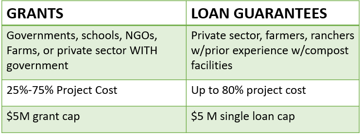 2) Infrastructure Funding: The bill provides a sustained source of funds for infrastructure for composting and after several months of discussion, the proposal for $2 billion for 10 years ($200 million annually). Projects can be selected for grants (private sector only qualifies for these by partnership with a municipality/nonprofit/farm) or loans (private sector qualifies), and are capped at $5 million per project with matching fund requirements (see table). A "carveout” of 25% annually for applications from backyard and small scale composting projects was reserved.