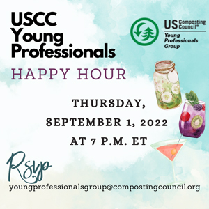 Looking for a way to relax after a long day at work? Join the USCC Young Professionals at our upcoming Virtual Happy Hour on Thursday, September 1, at 7:00 p.m. (4:00 p.m. PST). RSVP by emailing youngprofessionalsgroup@compostingcouncil.org to receive a Zoom invite.