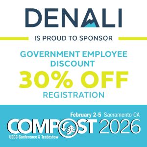 USCC Member Denali is sponsoring a 30% discount for government or municipal employees. Public-private partnerships are a keystone of the composting industry; engagement with municipalities is crucial to thriving composting programs and increasing organic waste diversion rates. We want as many government employees to attend COMPOST2026 as possible, and we hope that this 30% discount will help make that happen! If you are a government or municipal employee, please fill out this form to confirm your attendance. After we receive the form, we will send you your personal discount code for COMPOST2026 registration. You can find the municipal discount application form here.