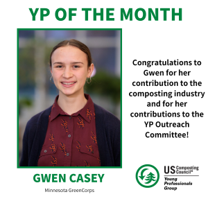 Gwen began working in the composting space as a sophomore in high school, washing buckets for a Chicago-area compost pick-up service. Since then, Gwen has remained involved in composting and passionate about its role in addressing climate change. For Gwen’s senior thesis at Carleton College, she studied methods to reduce methane emissions from the process of composting digestate. During her research process, Gwen had the opportunity to interview multiple industry experts and visit several compost and anaerobic digestion facilities in Minnesota and Illinois. Now, Gwen works to raise awareness of new compost drop-off sites in Robbinsdale, MN, as a member of the Minnesota GreenCorps. Gwen is excited to try different outreach methods she has seen work in other cities and help further the transition to composting.