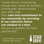 For the seventh straight year, Cedar Grove will offer four college scholarships, in the amount of $2500 each, to graduating seniors from four area high schools. Each scholarship will be awarded to a student who has demonstrated interest, action and achievement in issues surrounding sustainability and the environment (i.e. Green Team membership, Eagle Scout project involving building a garden, supporting school’s recycling and composting efforts, environmental courses, camps, etc.).