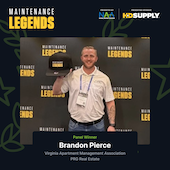 VAMA is proud to congratulate Brandon Pierce of PRG Real Estate on being named an October Maintenance Legend by the National Apartment Association (NAA). This national recognition, presented in partnership with HD Supply, celebrates maintenance professionals who go above and beyond for their teams, communities, and the industry—and Brandon exemplifies exactly that.