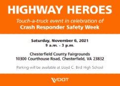 To kick off Crash Responder Safety Week (formerly National Traffic Incident Response Awareness Week) Nov. 8-14, the Virginia Department of Transportation (VDOT) will host “Highway Heroes,” a free touch-a-truck event to allow the public to see, hear and touch the vehicles and systems essential for responding to crashes on Virginia roads.